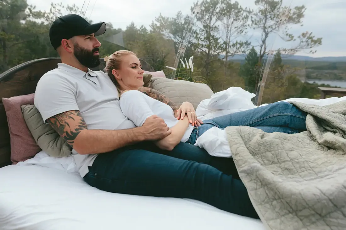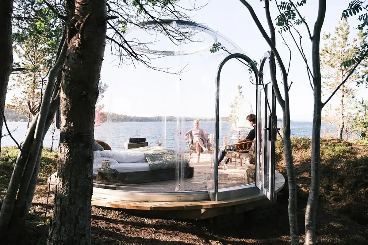 Store, gjennomsiktige domer gir deg følelsen av å sove under åpen himmel – uten å fryse. Nyt utsikten til fjell, skog eller hav mens du koser deg i en varm seng. Mange dome glamping-steder tilbyr også boblebad og peis for ekstra komfort.
