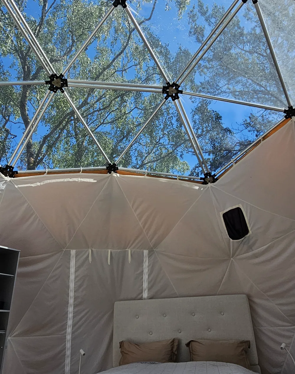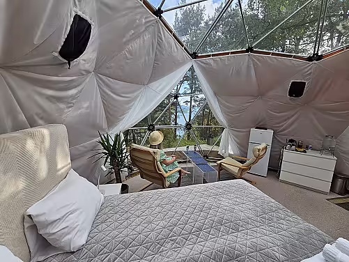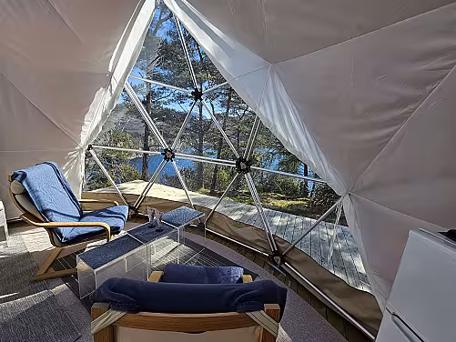 Domen er utstyrt med elektrisk oppvarming/kjøling, og gulvet er teppelagt. Sengen er ferdig oppredd og det finnes også håndklær man kan benytte seg av. I domen vil man også finne kjøleskap, vannkoker, kaffe, te, servise og bestikk i domen. Det er fjernstyrt LED lys hvor man kan endre farge og intensitet, slik at man selv kan sette stemningen for oppholdet. En Bluetooth høyttaler er tilgjengelig som man kan benytte seg av, samt muligheter for lading av mobil og laptop. Man vil få tilgang til fellesbad med toalett og dusj på eiendommen, og man vil også kunne benytte seg av utendørsmøblene utenfor domen. Ønsker man å grille under oppholdet finnes det en grill man kan benytte seg av. Det vil også være mulig å leie lader til elbil ved behov.