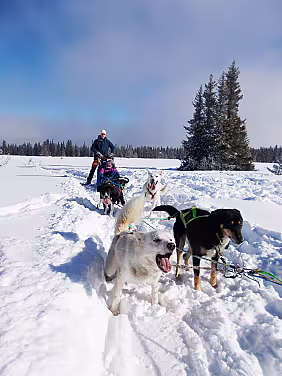 Opplev stillheten og villmarkens skjønnhet mens hundene trekker deg gjennom snødekte skoger