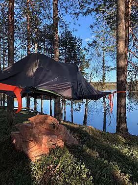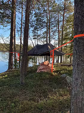 Midt i stille, mystiske og vakre Finnskogen møter man på ett telt som er beregnet til to voksne. Er man vant til å dele, er det plass til å ha et barn mellom seg. Svevetelt-campen ligger rett ved sjøen med gode fiskemuligheter for stang og fluefiske. På campen finner man bålpanne, utedo, ved og en putekasse fylt opp med alt man trenger på tur - bortsett fra mat og soveposer. Dette må man altså ta med selv.